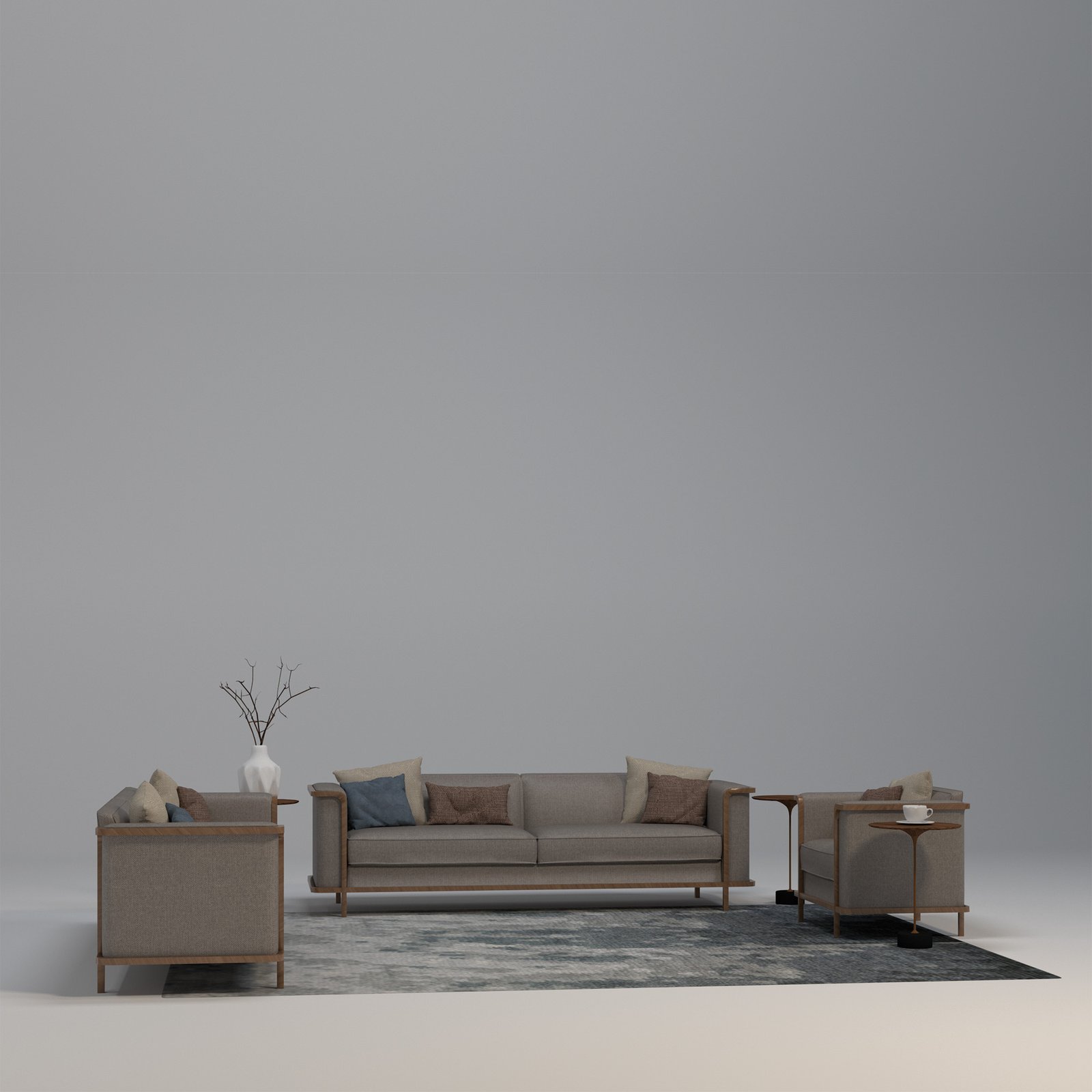 Bring timeless style to your interiors with this Mid-Century Sofa Set. Upholstered in taupe grey with warm walnut accents, it blends Scandinavian refinement with modern comfort, ideal for elegant living spaces.
