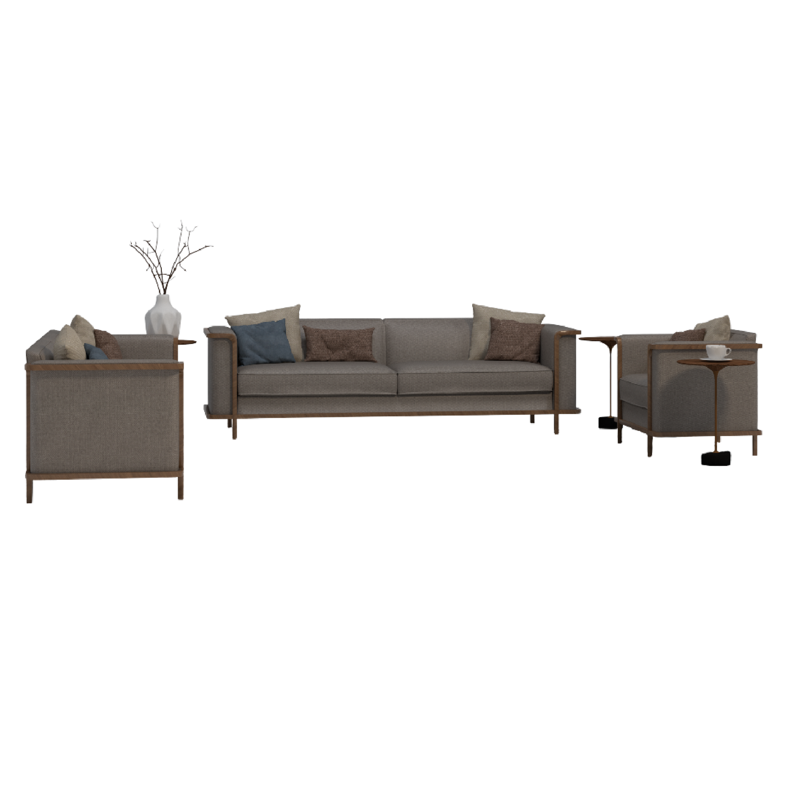 Our Mid-Century Sofa Set is crafted to bring refined elegance and comfort to modern living spaces. Upholstered in a taupe grey woven linen-textured polyester blend, it offers a matte finish with a sophisticated hand-feel. The solid wood box frame structure ensures lasting durability, while high-resilience foam with a fiber-fill wrap provides structured yet soft seating. Warm walnut brown accents and a walnut veneer base add natural warmth and timeless appeal. The solid wood legs and platform base in stained walnut further enhance its mid-century character. Designed as a Scandinavian fusion piece, this set is ideal for elegant sitting rooms, minimalist homes, lounge areas, and executive waiting rooms. With its blend of style, comfort, and functionality, it creates a complete seating solution that elevates any interior.