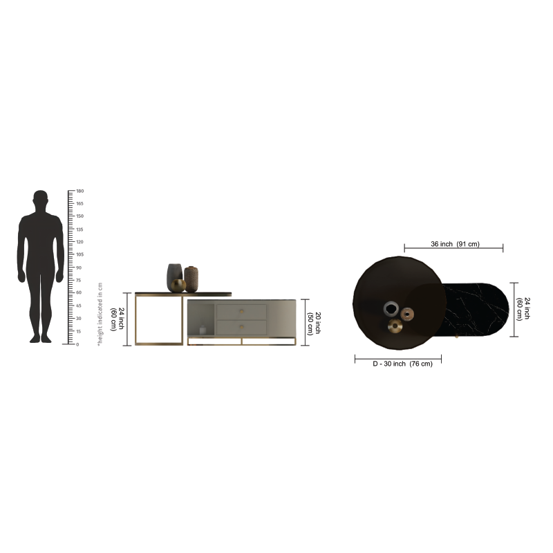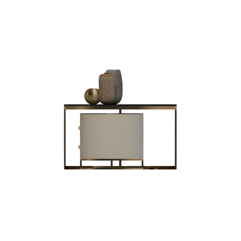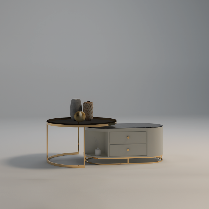 The Contemporary Dual-Level Center Table with Storage blends style, practicality, and elegance. Its walnut top exudes natural warmth, complemented by a gold-finished metal frame and sleek grey drawers that provide concealed storage. The layered structure adds visual depth while enhancing organization in luxurious spaces. Ideal for high-end living rooms and lounges, it balances form and function beautifully. This table redefines sophistication, making utility a part of contemporary design expression.