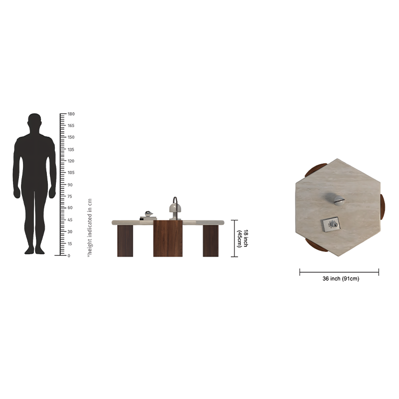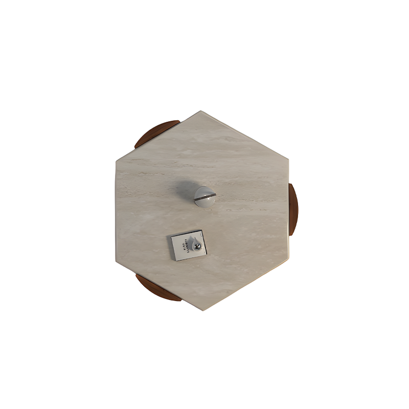 A modern hexagonal center table featuring a soft beige marble top paired with rich walnut wood panels, offering a sculptural yet organic appeal for contemporary spaces.