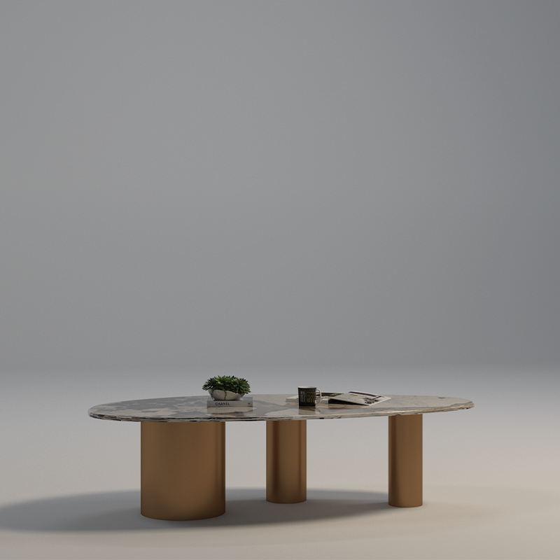 The Contemporary Marble-Top Centre Table is a statement in simplicity and luxury. Its polished white marble surface with natural grey veining rests gracefully atop matte bronze cylindrical legs, offering both strength and sculpture-like appeal. The seamless cylindrical base design creates visual symmetry while maintaining stability. Perfect for high-end lounges or elegant living spaces, it blends natural textures with metallic refinement. A true centerpiece that reflects both artistic craftsmanship and functional beauty.