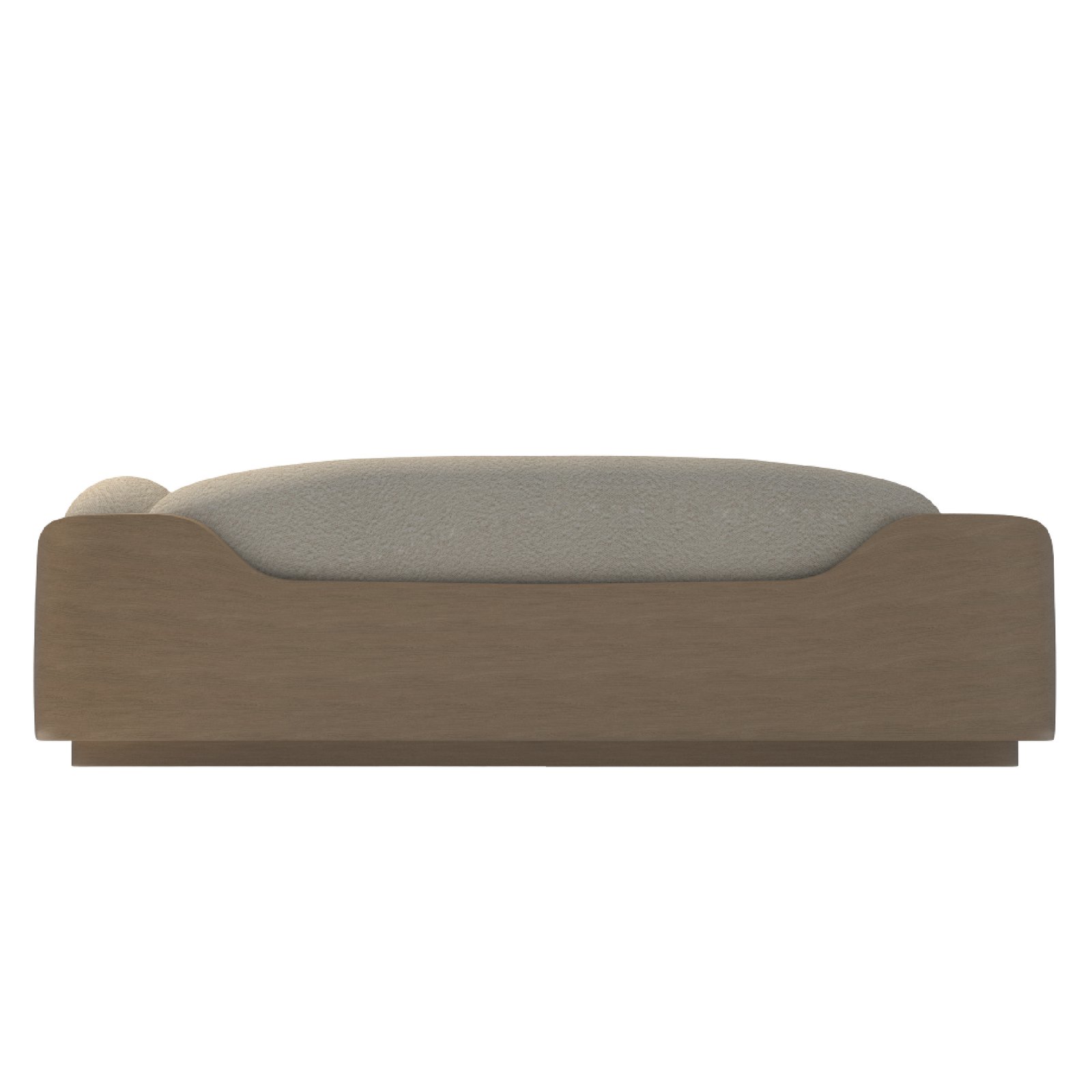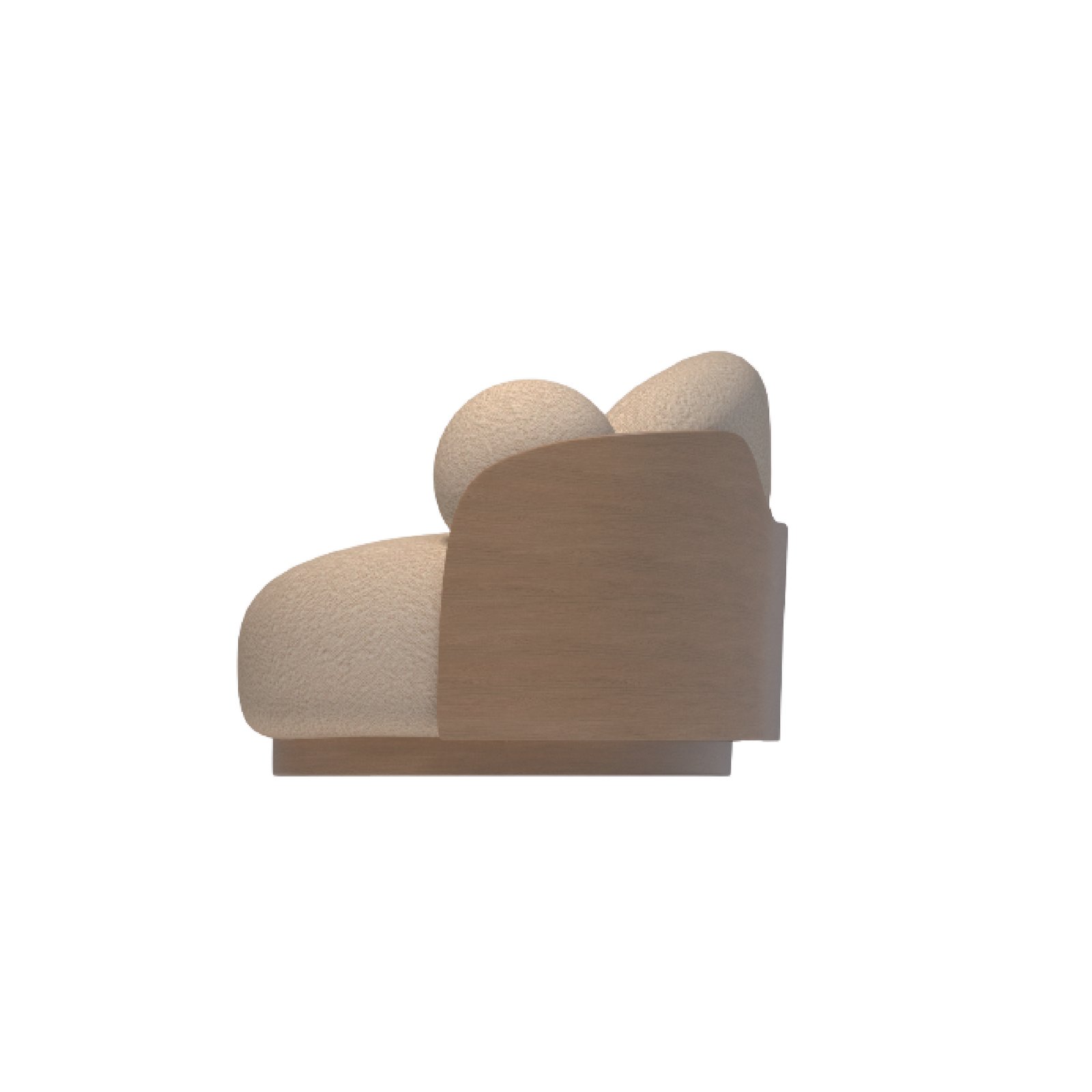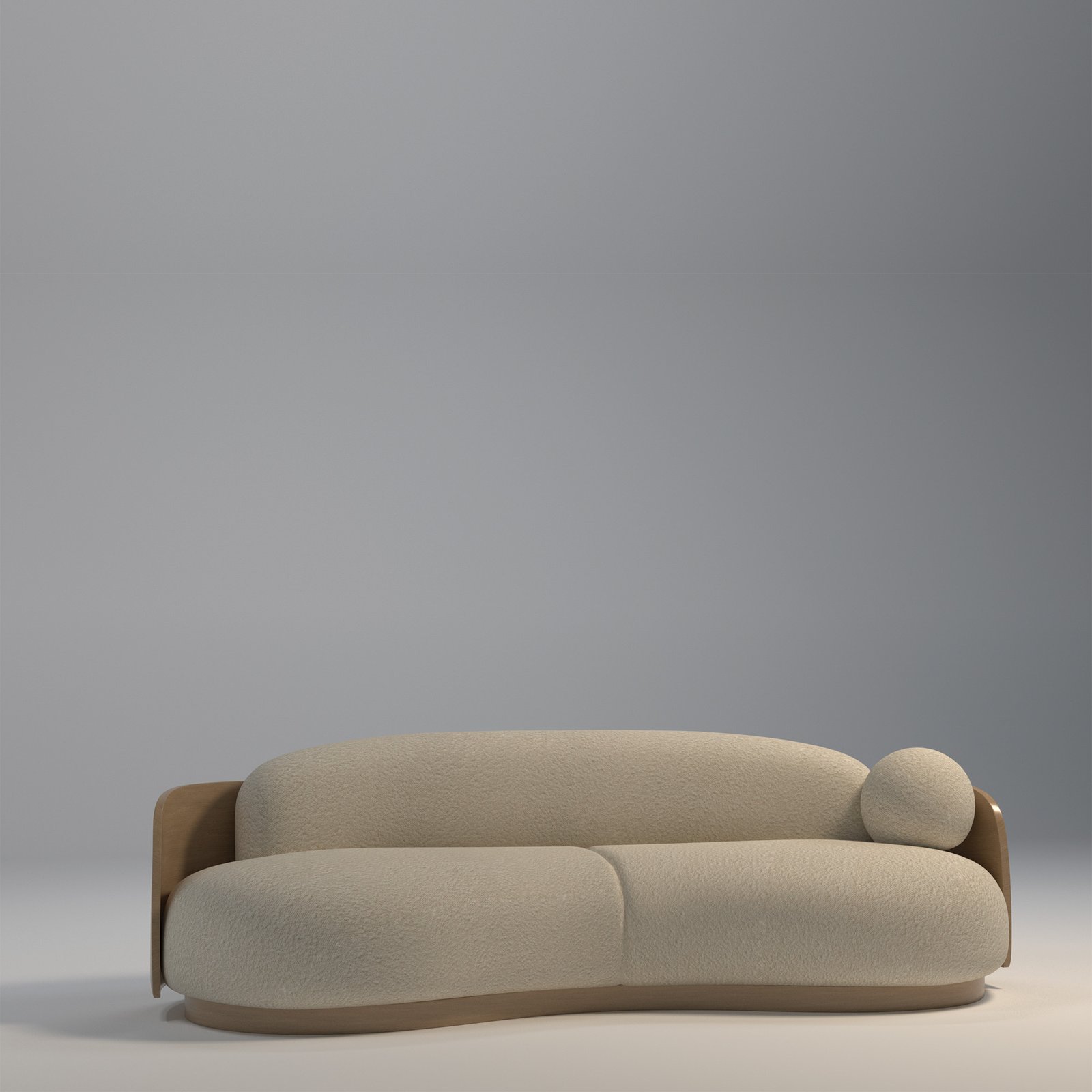 Our Curved Cloud-Form Sofa is a statement of organic modern design, blending sculptural aesthetics with luxurious comfort. The solid wood frame and curved wooden platform base with smooth edges provide durability and elegance, while the natural oak finish adds warmth to any space. Upholstered in soft cream beige boucle fabric, the sofa offers a cozy woolly hand-feel with rich tactile appeal. The multi-density foam core, topped with a feather-soft layer, ensures cloud-like seating comfort. Finished with laminated natural wood and a protective matte coating for strength and visual charm, this sofa is perfect for minimalist interiors, modern lounges, curated design spaces, and boutique lobbies. Its organic silhouette and Scandinavian luxe detailing make it both a functional piece and a work of art.
