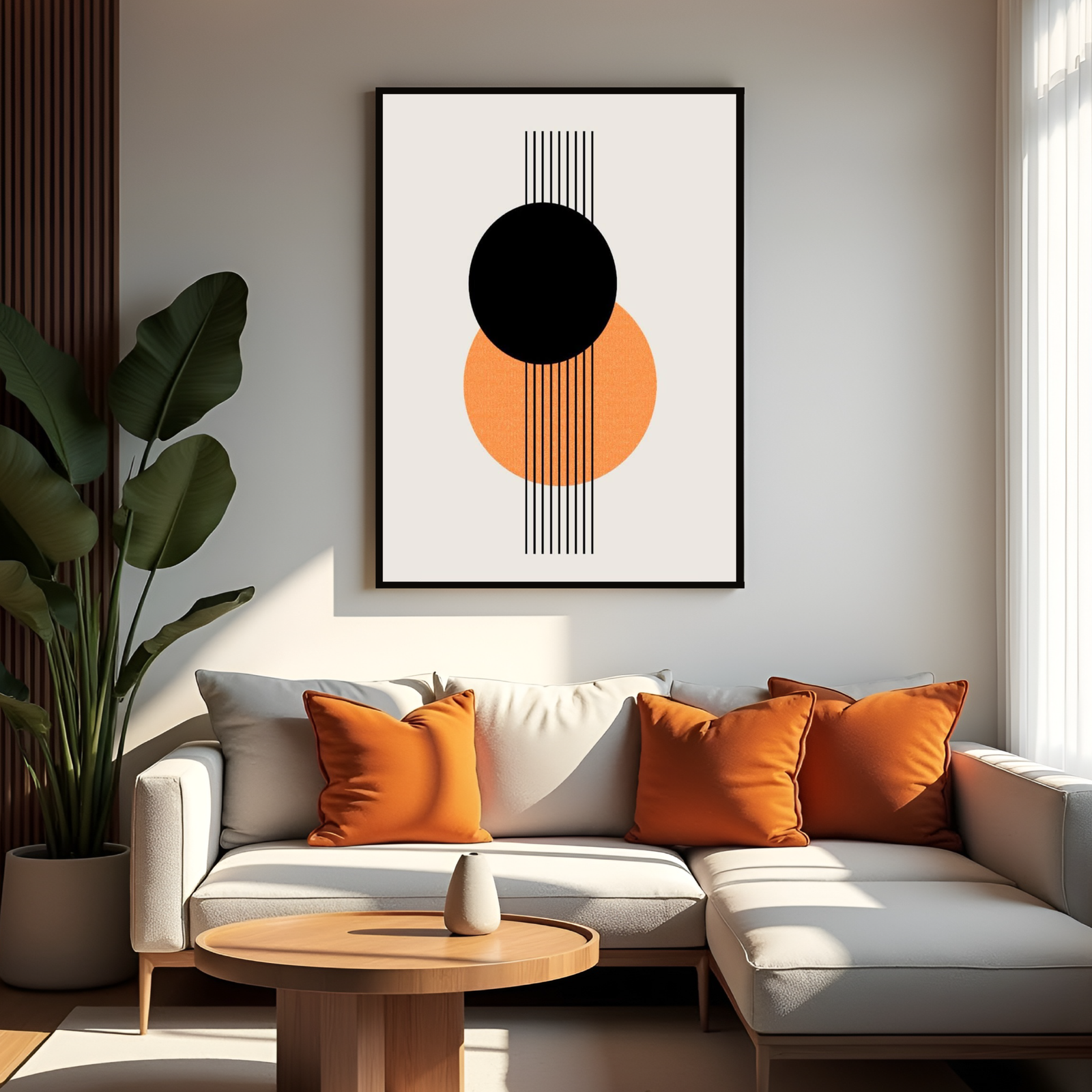 A [theme/mood] wall art print featuring [subject/visual description], printed on [canvas / vinyl] with a [colour] wooden frame. Designed in a [style] aesthetic, it suits [room types or settings].