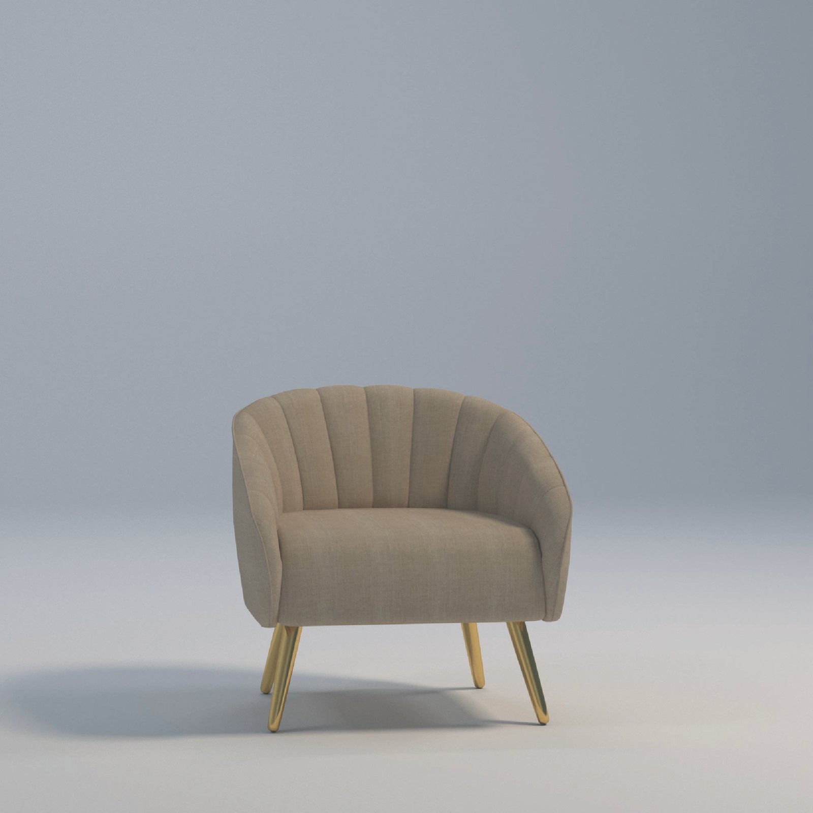 An art deco-inspired lounge chair in warm taupe beige with a brushed gold frame, luxurious, inviting, and timeless.
