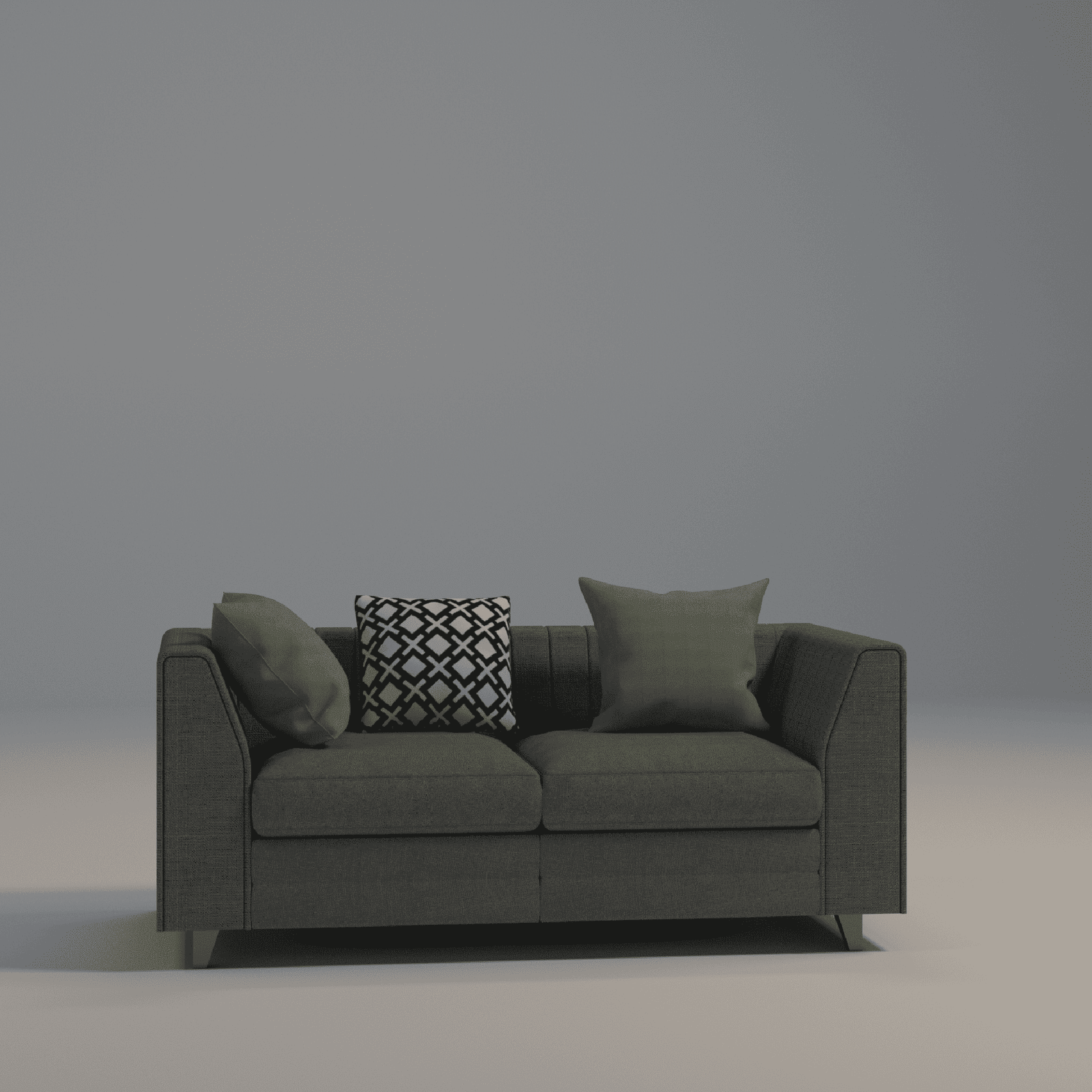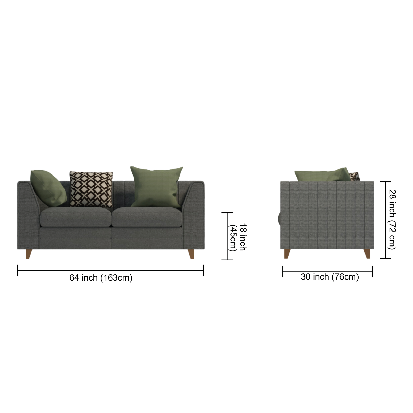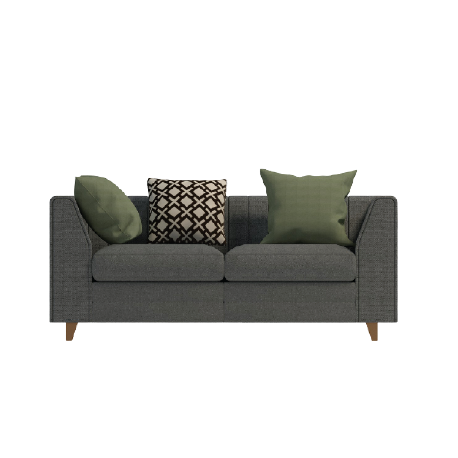 A modern 2-seater sofa with deep, comfortable seating and a sleek silhouette. Upholstered in charcoal satin-finish woven linen/polyester, it features high-density foam cushions and stylish olive green and geometric black-and-white accent pillows. Gold powder-coated legs add a touch of elegance, making it ideal for contemporary living rooms with moderate space.