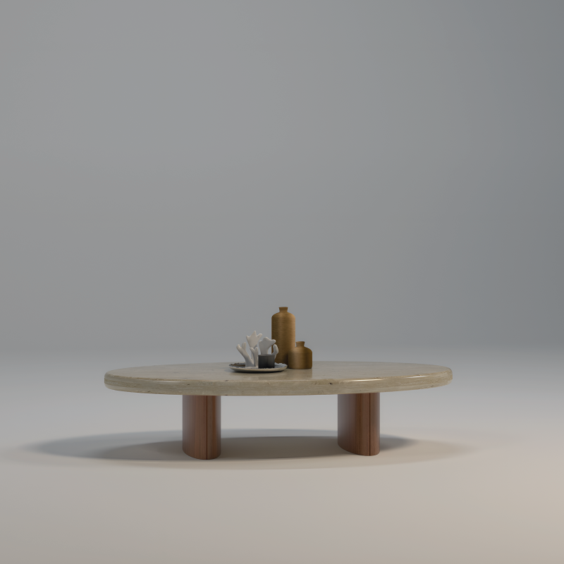 A refined coffee table with a beige stone top and walnut pedestal legs. Through this, natural texture meets modern craftsmanship.